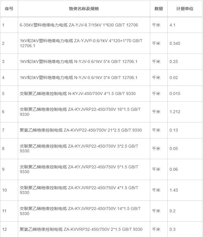 塔里木油田各二级单位所需电力电缆、控制电缆等共27项。